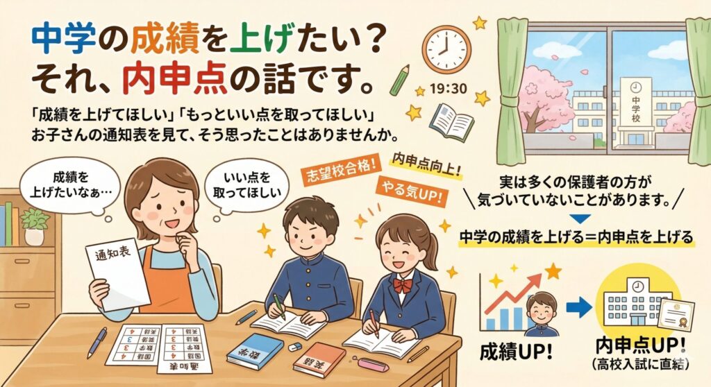 「成績を上げてほしい」「もっといい点を取ってほしい」 お子さんの通知表を見て、そう思ったことはありませんか。 実は多くの保護者の方が気づいていないことがあります。中学の成績を上げるということは、そのまま内申点を上げるということです。 成績=... -
