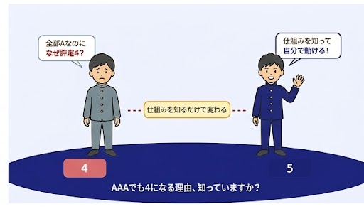 【全4回シリーズ・内申点の正体】 第1回:内申点の正体(https://naishin-up.com/naishin-ten-toha) 第2回:AAAでも評定4になる理由(https://naishin-up.com/naishin-aaa-demo-4) 第3回:内申点は入試でどう使われる?計算方法と地域ごとのルール(http... -