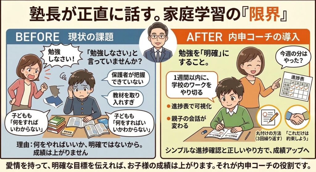 4年間で、100名以上の中学生を指導してきました。 今日は塾の経営者として、正直に話します。 塾には限界があります。そして家庭学習にも限界があります。この両方の限界を理解することが、お子様の成績を上げる第一歩だと思っています。 内申コーチでは、...