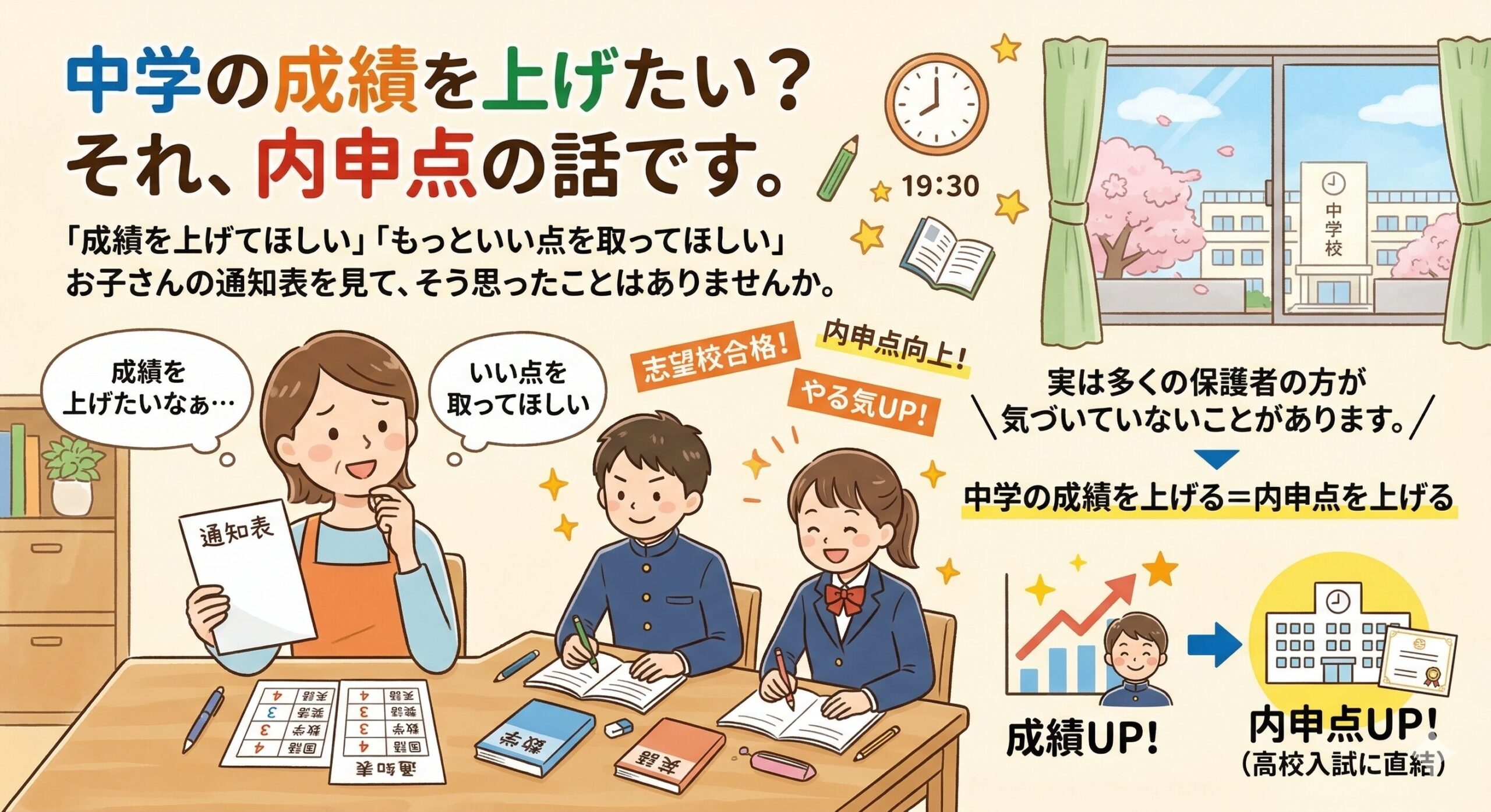 実は多くの保護者の方が気づいていないことがあります。中学の成績を上げるということは、そのまま内申点を上げるということです。